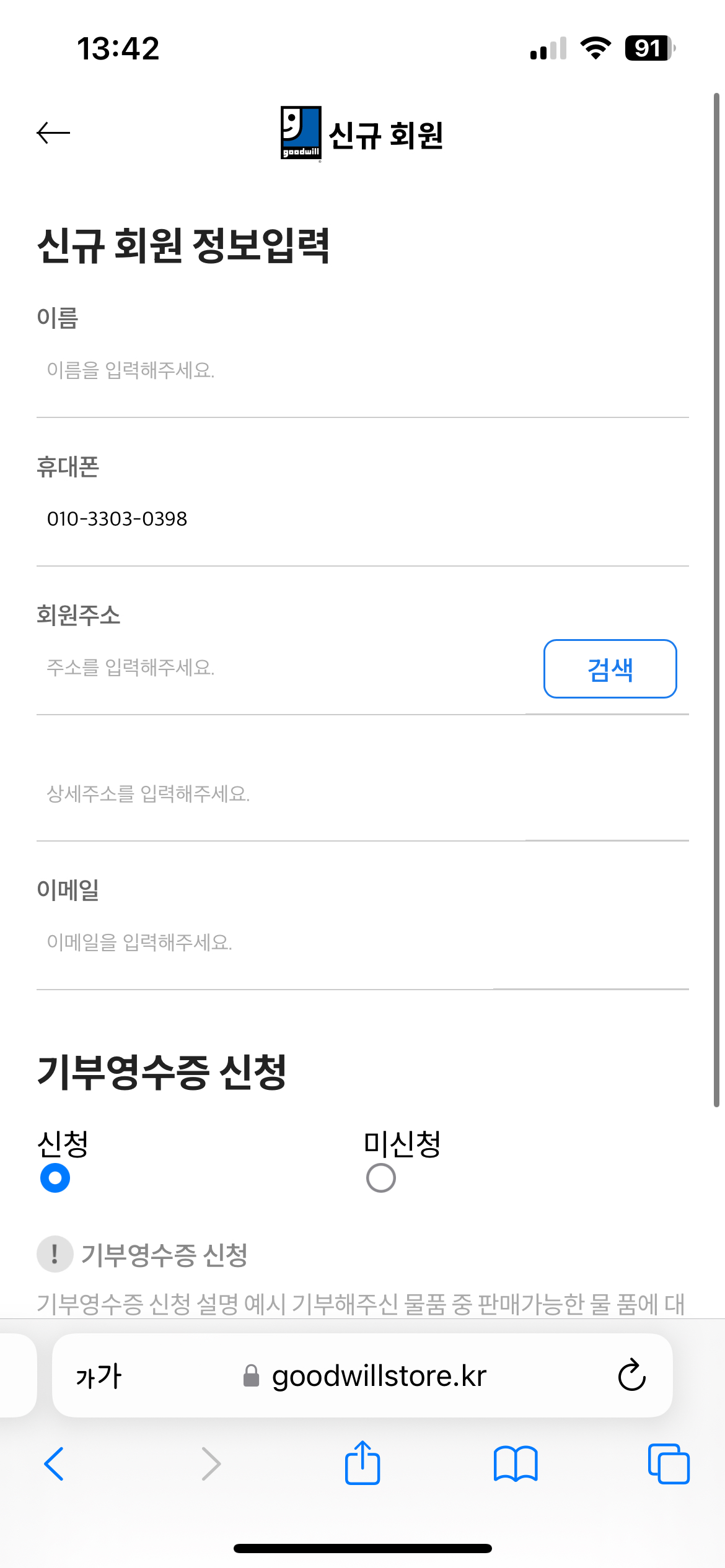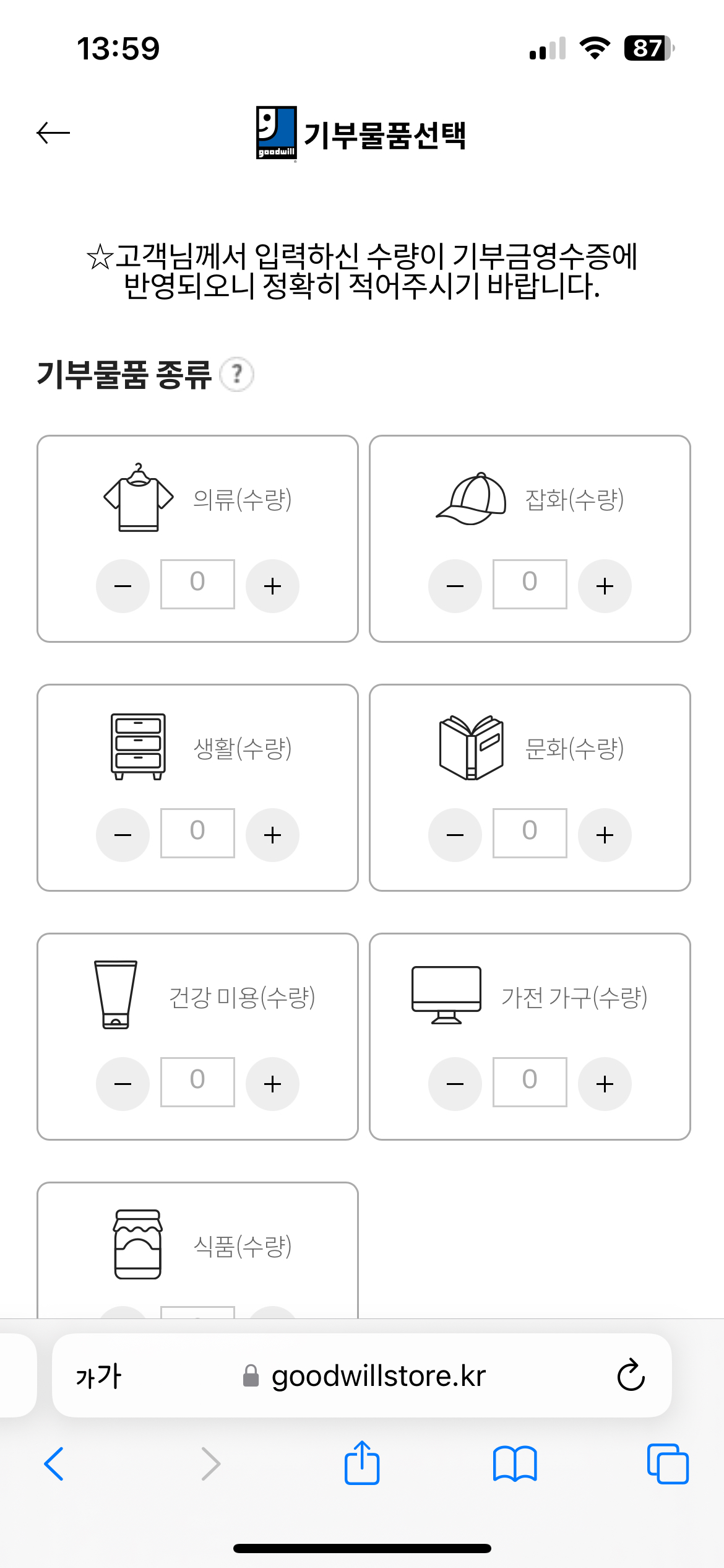 개인인증을 받고 신규 회원 가입을 진행 후 기부물품의 종류를 적어주세요. 그동안 입지 않는 옷과 기타 제품들 개수에 맞게 잘 체크해주세요.
