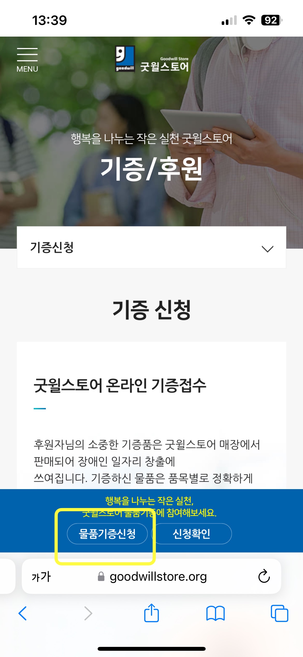 굿윌스토어 홈페이지에서 기증/후원, 물품기증신청을 클릭하시고 개인정보처리방침 동의까지 해주세요.