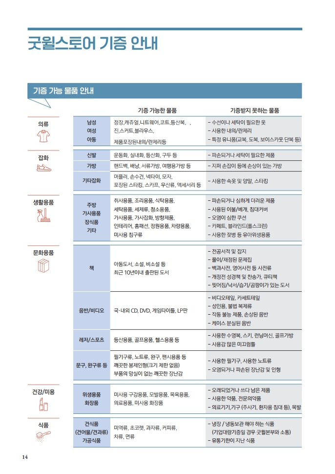 대형 가구나 설치가 필요한 전자제품, 오래된 아동 전집, 큰 플라스틱 장난감, 사용한 침구, 속옷 이외에는 모두 기증 가능합니다.