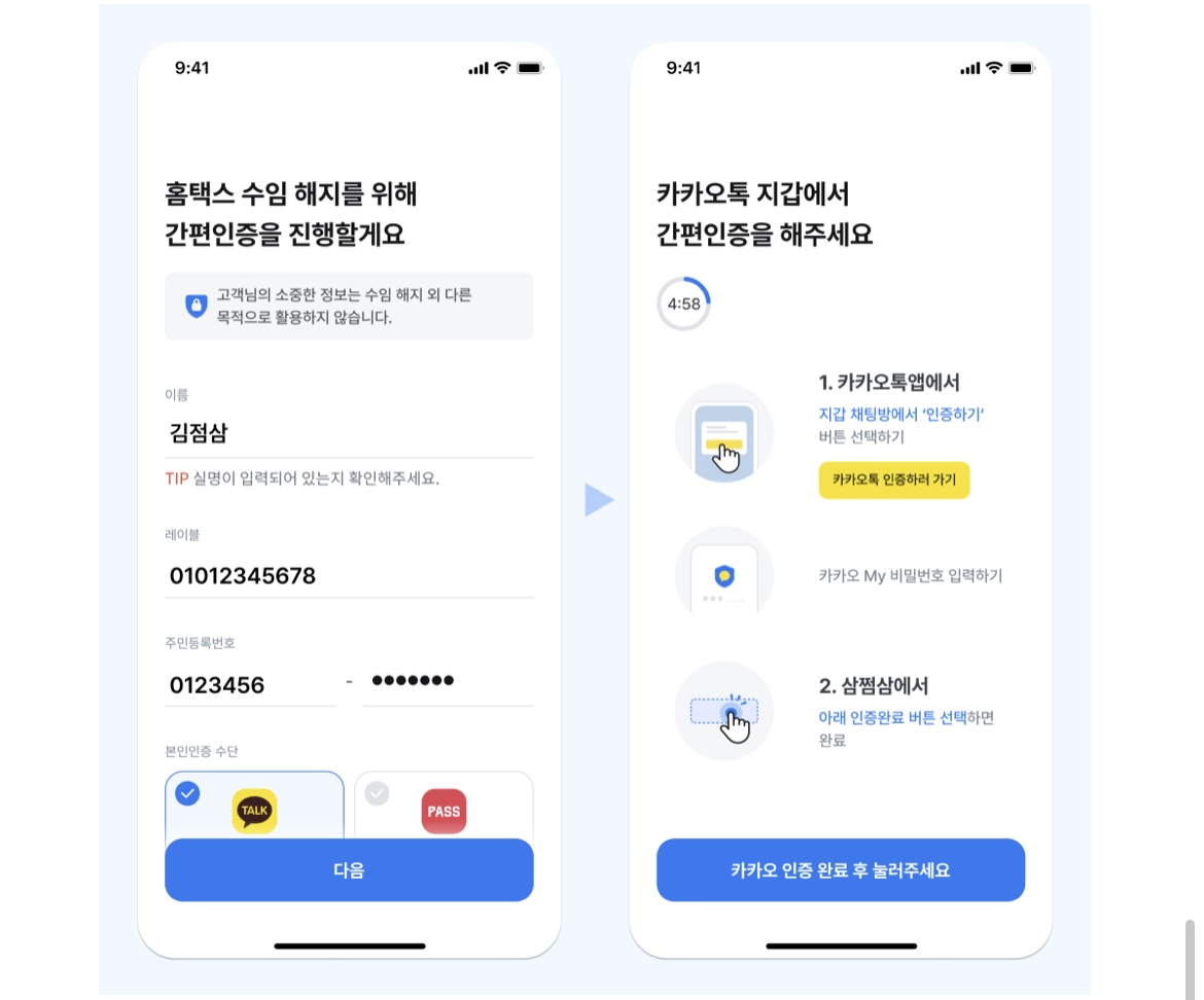 ※ 또한, 개인정보는 암호화된 SSL 프로토콜을 이용한 HTTPS 세션 네트워크를 통해 암호화 알고리즘을 사용하여 데이터에 접근할 수 있도록 안전하게 보호됩니다. 현재 최고 보안 수준의 클라우드 업체인 AWS 서버에 전송 후 이중으로 암호화하여 고객님의 모든 인증 정보를 안전하게 관리하고 있습니다. 보다 자세한 사항은 개인정보 처리방침의 상세 내용을 확인해 주시기 바랍니다.